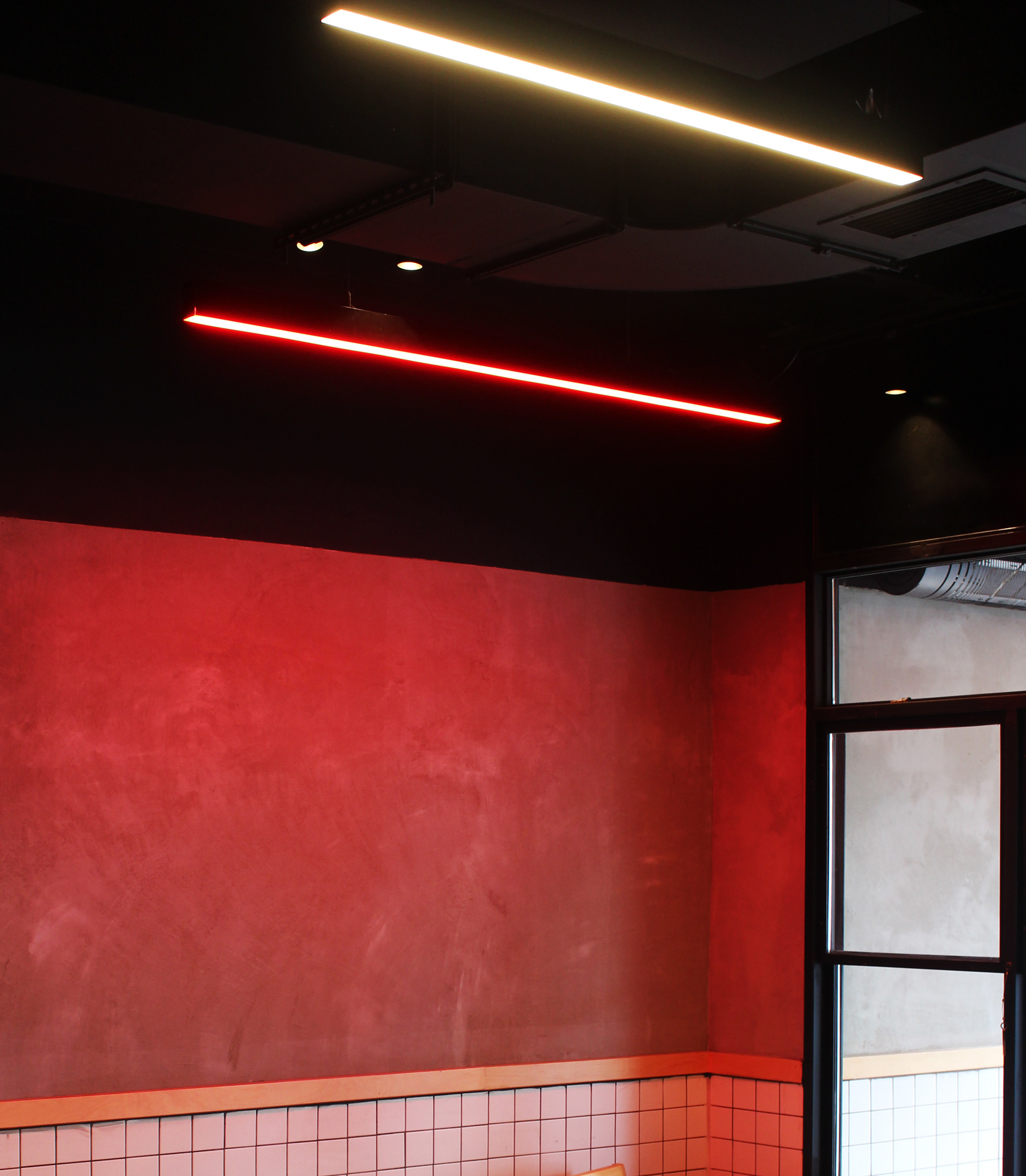 The walls in CrossFingers not only serve as blank canvases for Piknik's spatial drawings, but they also create a bright and airy atmosphere in the space. The use of white tiles on the walls enhances this effect, giving the restaurant a fresh and modern look. To complement the white surfaces, Piknik incorporated bold red LED lights throughout the space, creating a vibrant and energetic ambiance that evokes the feeling of being at a bustling street food market. This dynamic combination of white and red elements perfectly captures the youthful, edgy spirit of CrossFingers and its street food-inspired cuisine.